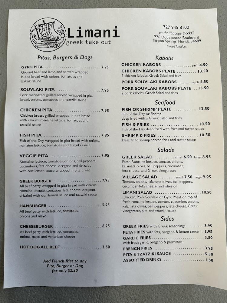 Welcome to The Limani, a vibrant restaurant located in the heart of Tarpon Springs, Florida. Enjoy a delightful range of local specialties, from mouth-watering gyros and souvlaki to fresh fish and chips, all served in a relaxed atmosphere perfect for groups and solo diners alike. With amenities like a spacious terrace, takeout and delivery options, and wheelchair accessibility, we cater to every guest's needs. Join us for lunch or dinner and experience quick, friendly service alongside healthy, traditional cuisines. Reservations are welcome, and our convenient parking options add to the ease of your visit. Come taste the flavors of Greece at The Limani!